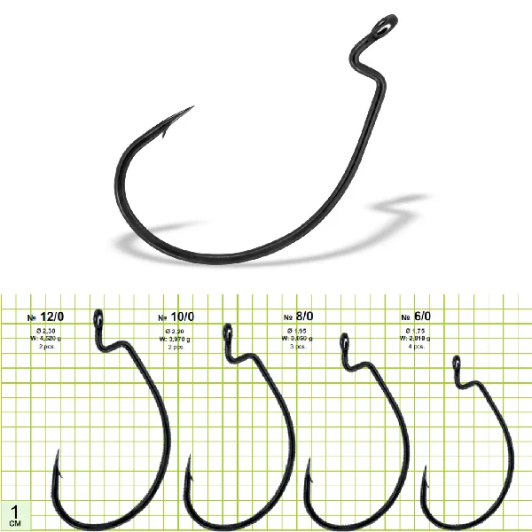 Большой и мощный офсет для ловли трофейного хищника в достаточно сложных местах ловли (большие глубины, коряжник, кустарники). Широкий поддов крючка позволяет использовать большой диапазон мягких приманок, включая большие широкотелые "шеды" и "риперы", а также позволяет более надежную фиксацию трофея при выведении. Крючок имеет высококачественное жало с заточкой Cutting Point CP. Нежная микробородка крючка так же способствует отличному проникновению в ткани трофея при поклевке. Крючок изготовлен из высокоуглеродистой стали, произведенной в Бельгии и имеет высококачественное антикоррозионное покрытие черный хром.
