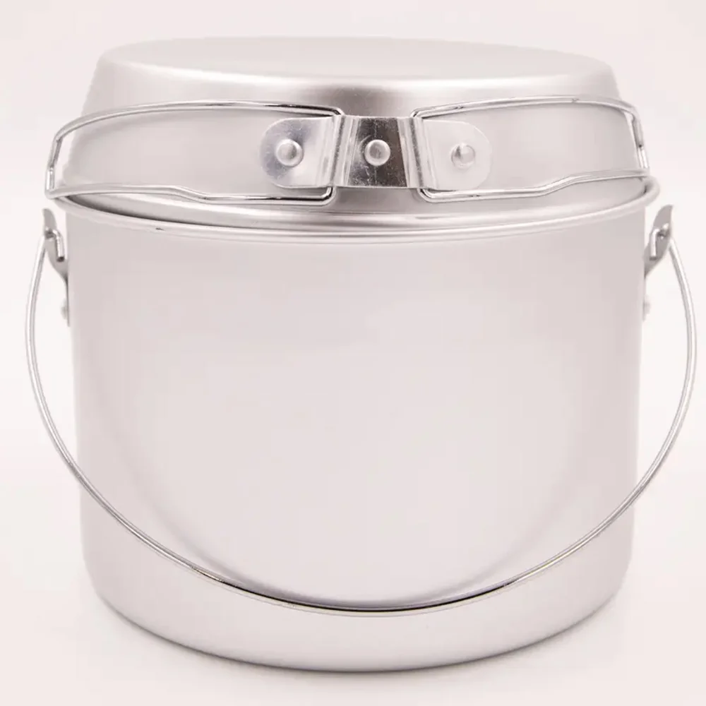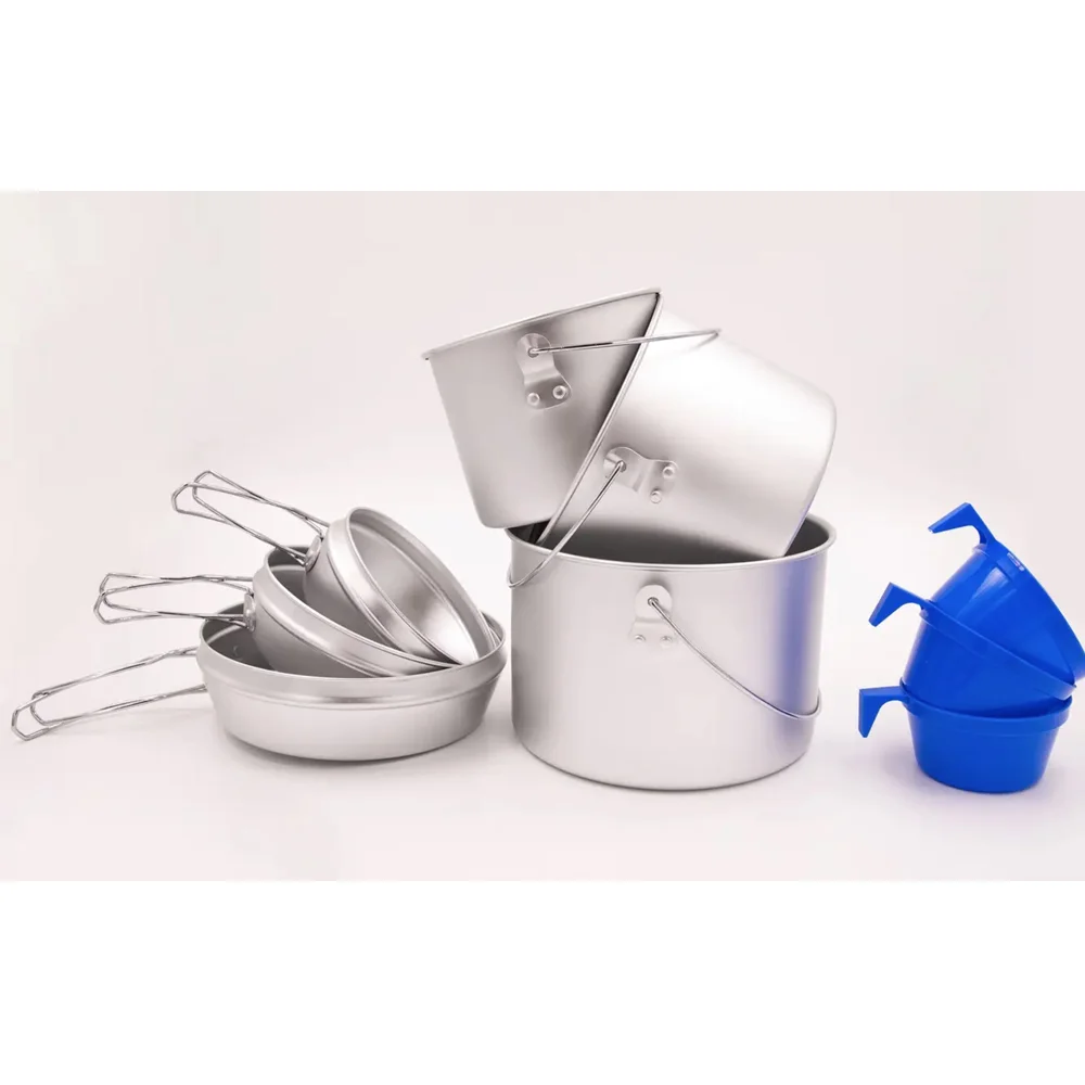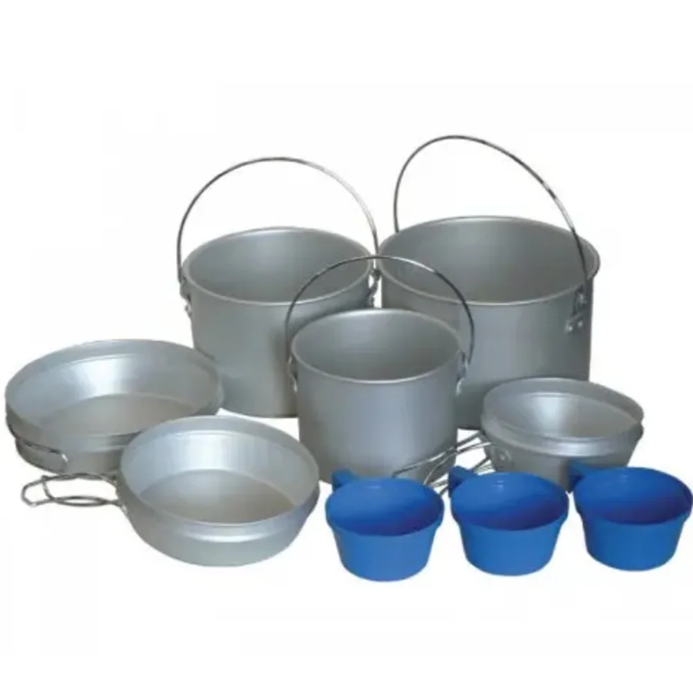 Набор походной посуды из алюминия состоит из: котелка 1,9 л, с дужкой, крышки-сковородки со складными ручками, котелка 2,9 л, с дужкой, крышки-сковородки со складными ручками, котелка 1,2 л, с дужкой, крышки-сковородки со складными ручками, пластмассовых кружек (3 шт.)