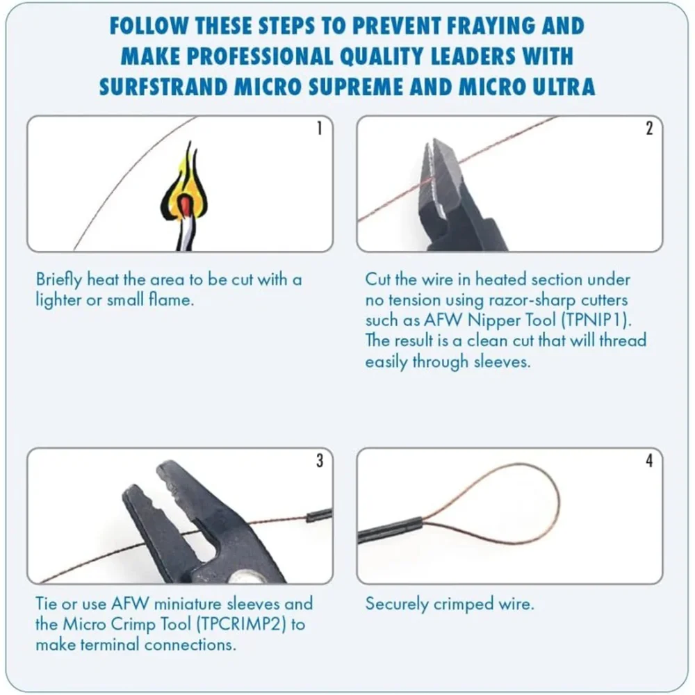 Изготовление поводков самостоятельно обеспечит рыболову уверенность в прочности и надежности. Поводочный материал AFW Surfstrand Micro Supreme 7x7 является одним из лучших решений для изготовления поводков. Данный материал сплетен из 49-ти тонких волокон нержавеющей стали, что делает его очень мягким и устойчивым к абразивному воздействию. Также следует отметить высокую прочность на разрыв. Благодаря универсальности материала, при его монтаже возможно использовать как стандартные обжимные трубки, так и вязать его узловыми соединениями. Еще одним преимуществом данного материала, является то, что рыболов сможет индивидуально под любые условия подбирать нужную длину готового поводка.