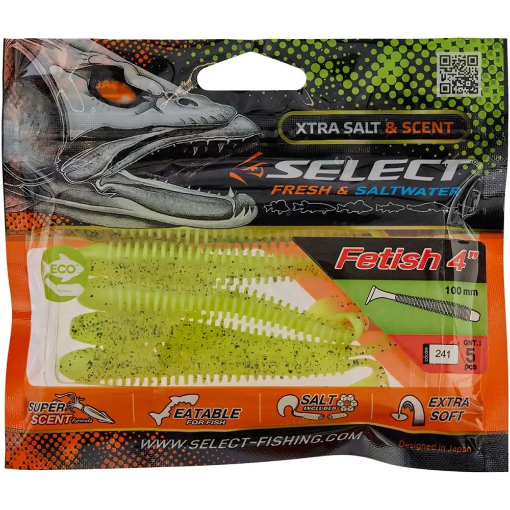 Select Fetish – виброхвост вытянутой формы, всё тело которого покрыто мягкими рёбрами. Во время проводки, за счёт эластичности материала, хвост очень размашисто виляет по сторонам, вибрация от которого с большого расстояния привлекает рыбу. Рёбра на теле выполняют несколько функций. Во-первых, они создают дополнительную вибрацию, привлекающую рыбу. Во-вторых, рифлёное тело на много мягче цельного, что позитивно сказывается на игре приманки. В-третьих, при поклёвке рыбы, рёбра легко сминаются и начинают активно выделять вкусовые добавки, содержащиеся в составе силикона, так что рыба не замечает подвоха и продолжает его заглатывать. Помимо классической джиговой проводки, ввиду своей формы, приманка показывает хорошие результаты при протягивании по дну. Соблазнительные виляния всем телом и муть, поднимающаяся со дна джиг-головкой, активно привлекают внимание рыбы, которая смело бросается на силикон.