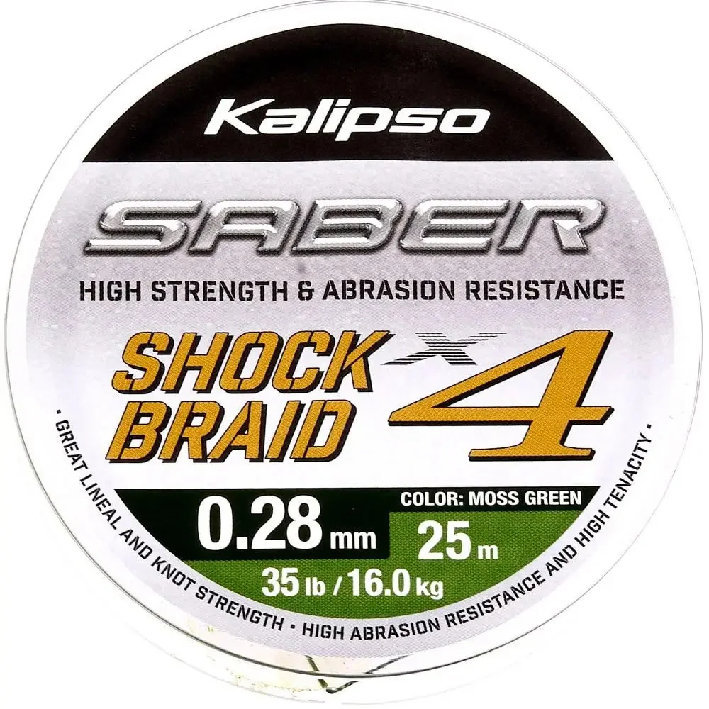 Шнур Kalipso Saber Shock Braid X4 – высококачественный 4-жильный материал, основное предназначение которого использование в качестве шок-лидера, позволяющего осуществлять силовой упрек тяжелых оснасток при рыбалке с тонкими лесками.