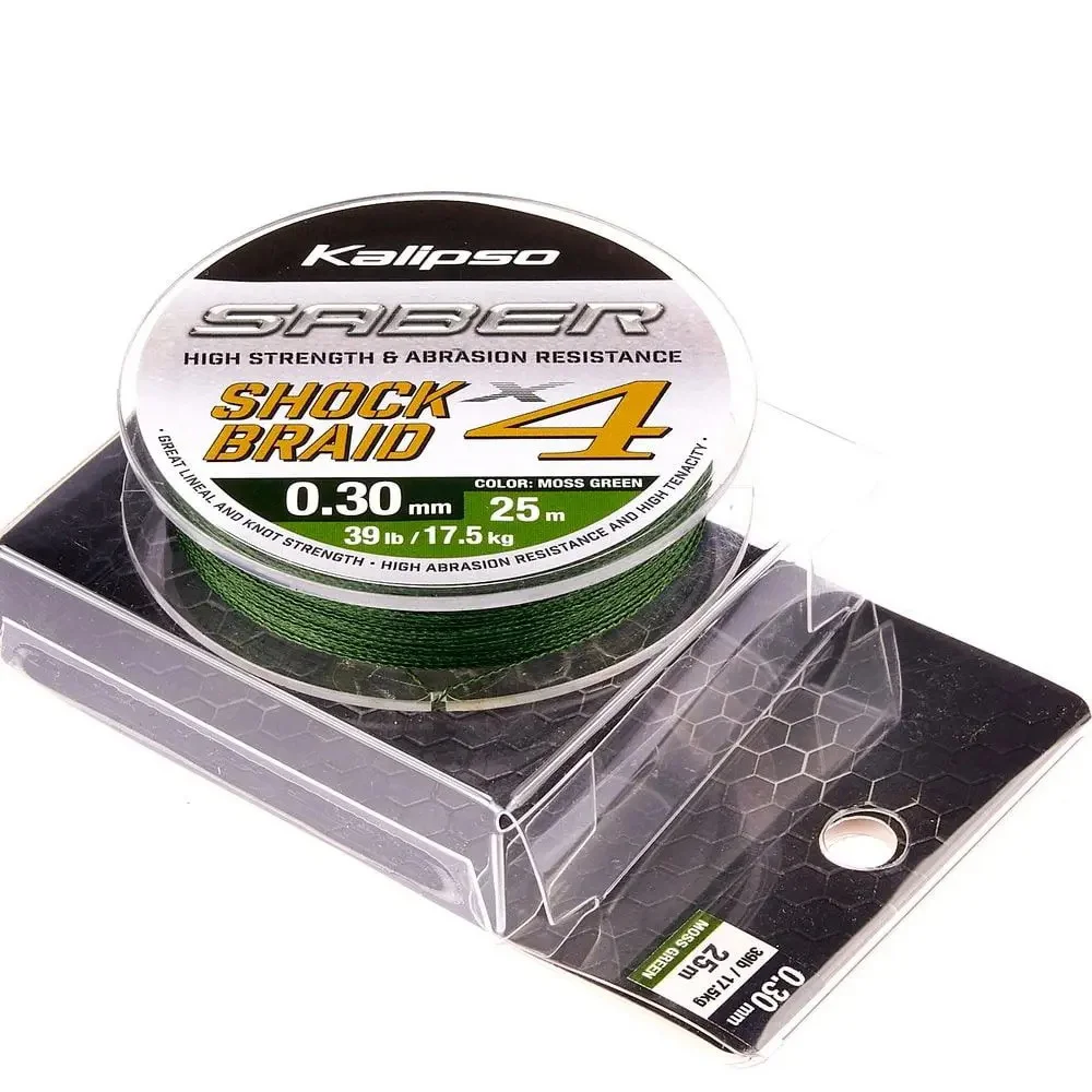 Шнур Kalipso Saber Shock Braid X4 – высококачественный 4-жильный материал, основное предназначение которого использование в качестве шок-лидера, позволяющего осуществлять силовой упрек тяжелых оснасток при рыбалке с тонкими лесками.