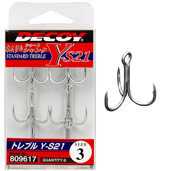 Decoy Y-S21 – тройники классической формы с длинным струйкой и жалом загнутым внутрь. Подходят для оснащения всех типов приманок во время ловли хищной рыбы. Имеют антикоррозионное покрытие, позволяющее использовать эти тройники в морской ловле. Уникальная химическая заточка позволяет крючкам очень долгое время оставаться острым.