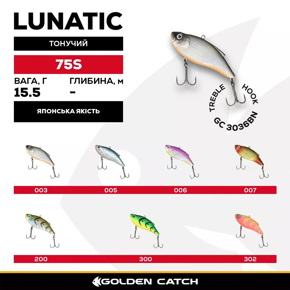 Воблер GC Lunatic 75S – ратлин средних размеров, имеющий широкий профиль тела. Модель идеально подходит для облова ям и свалов в глубину – как на стоячих водоемах, так и на реках. Обладая средним весом и универсальным размером, Голден Кэтч Лунатик отлично взаимодействует с большинством спиннингов, ориентированных на ловлю щуки и судака. Профиль тела воблера очень близок к форме молодых леща и карася – эти рыбы часто являются любимой пищей щуки и крупного судака. GC Lunatic 75S имеет отличную балансировку, которая поддерживает положение воблера даже при интенсивной анимации на разных глубинах. Внутренние балансировочные шарики создают в закрытых камерах легкий раздающийся звук, воспринимаемый хищником на расстоянии. Лунатик не требователен к поводку, его стойкую размашисто-вальяжную игру сложно нарушить. Ратлин оснащен двумя мощными тройниками, способными противостоять крупнейшим судакам и щукам украинских водоемов. Воблер очень пластичен по отношению к анимации, но главным методом подачи модели является неспешный двойной подрыв и ступенчатая проводка, осуществляемая преимущественно за счет работы катушки. Линейка GC Lunatic 75S включает эффективный спектр натуральных и провоцирующих цветов, которые являются стабильно действенными вариантами в наших условиях.