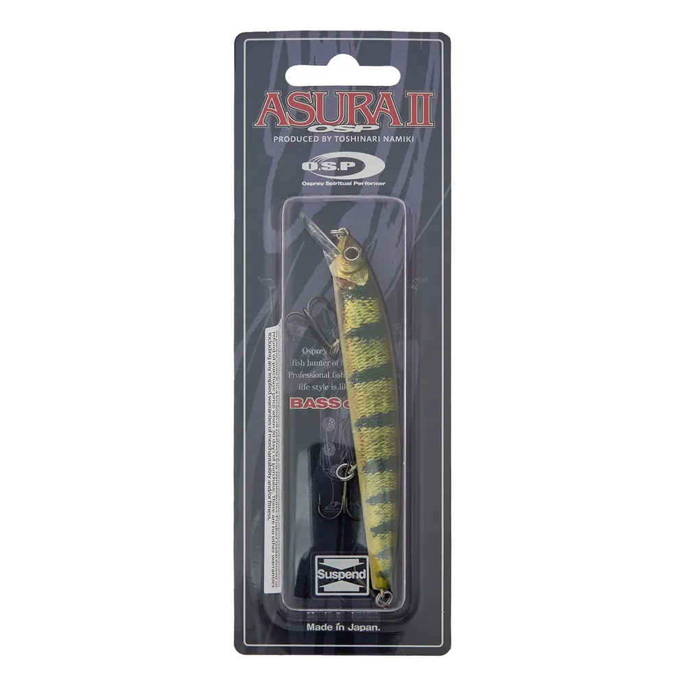 Воблер OSP Asura - первый в мире девятисантиметровый джеркбейт, выпущенный O.S.P Inc. с тремя крючками. Три крючка на, казалось бы, небольшом теле приманки реализуют больший процент поимки рыбы и полностью исключают пустые поклевки. Благодаря уникальной системе динамической балансировки, Asura является рекордсменом по дальности заброса и обладает привлекательной и стабильной игрой во время проводки. Приманка соблазнительно рыскает в стороны, делает хаотичные броски и переворачивается практически показывая брюшко — таким образом, осуществляет так называемый мерцающий бросок, максимально привлекающий рыбу. Идеально подходит для ловли в стоячей воде и на течении, так как хорошо держит струю. Воблер OSP Asura применяется для ловли разнокалиберной щуки, ночного судака, крупного окуня, а иногда заложником его привлекательной игры становится даже жерех. Воблер O.S.P Asura II - обновлённая модель, которая получила более широкую лопатку, установленную под другим углом. Благодаря этому, удалось добиться более выразительной игры на равномерной проводке и большей отзывчивости на рывках различной интенсивности.