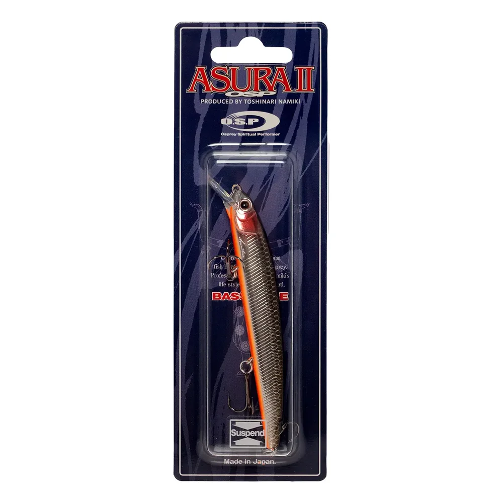 Воблер OSP Asura - первый в мире девятисантиметровый джеркбейт, выпущенный O.S.P Inc. с тремя крючками. Три крючка на, казалось бы, небольшом теле приманки реализуют больший процент поимки рыбы и полностью исключают пустые поклевки. Благодаря уникальной системе динамической балансировки, Asura является рекордсменом по дальности заброса и обладает привлекательной и стабильной игрой во время проводки. Приманка соблазнительно рыскает в стороны, делает хаотичные броски и переворачивается практически показывая брюшко — таким образом, осуществляет так называемый мерцающий бросок, максимально привлекающий рыбу. Идеально подходит для ловли в стоячей воде и на течении, так как хорошо держит струю. Воблер OSP Asura применяется для ловли разнокалиберной щуки, ночного судака, крупного окуня, а иногда заложником его привлекательной игры становится даже жерех. Воблер O.S.P Asura II - обновлённая модель, которая получила более широкую лопатку, установленную под другим углом. Благодаря этому, удалось добиться более выразительной игры на равномерной проводке и большей отзывчивости на рывках различной интенсивности.