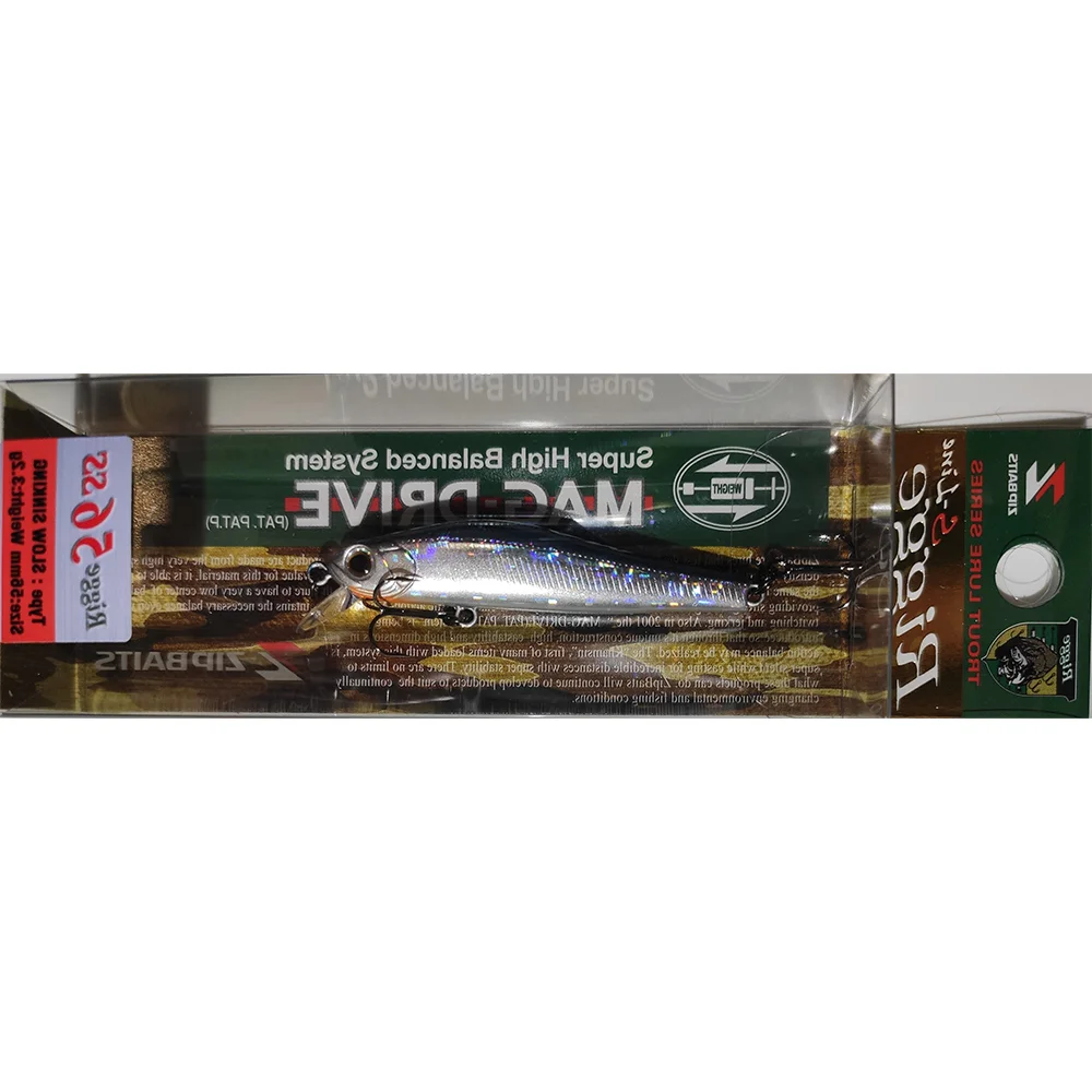 Японский воблер ZipBaits RIGGE 56SS – уловистая приманка класса Minnow, ставшая культовой не только на внутреннем японском рынке (JDM), но далеко за его пределами. опытных «зубров». В отличие от аналогичных «менношек» с классической прогонистой формой, 56-й «ридж» имеет более округлый корпус, без выраженных плоскостей по бокам. Области применения как лучшая приманка для ловли лососевых видов рыбы, в том числе прудовой и ручьевой форели. с возможностью углубления до 1 метра. Такая особенность позволяет облавливать как мелководные участки водоема, так и прочесывать глубоководные локации в поисках трофеев. Конструктивные особенности Ультралайтовая приманка изготовлена из качественного ударопрочного пластика. В передней части установлена углубляющая широкая лопасть имеет форму сплющенной капли. Металлическая петля для крепления поводка вмонтирована непосредственно у прозрачного тела лопатки, что положительно повлияло на общую игру. Сходства с живым «мальком» добавляют немного выпуклые 3D-глаза. Внутри корпуса японские воблеростроители реализовали запатентованную компанией ZipBaits технологию Mag-Drive - магнитную систему дальнего заброса и точной балансировки. длина - 56 мм; вес - 3.2 грамма; рабочая глубина - 0,3-0,8 метра; тип - медленно-тонет (Slow Sinking).