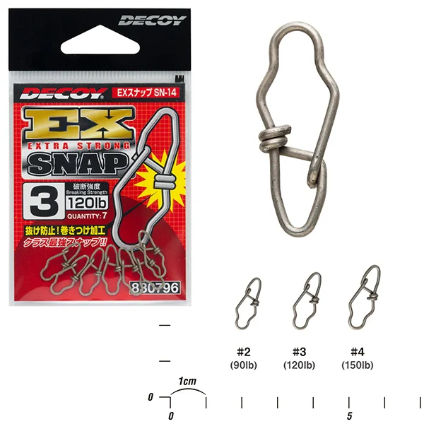 Застежка Decoy SN-14 Ex Snap разработана производителем в 2019 году и сразу же получила звание самого крепкого карабина по соотношению габаритов к максимально допустимой нагрузке. Особая V-образная форма изделия и применяемый металл способствуют высокой надежности, но даже при пограничных нагрузках застежка не разгибается, а наоборот затягивается, сохраняя целостность снасти. Изгиб, в который заправляется проушина приманки, имеет увеличенный размер, что способствует легкой и быстрой замене мормышки или воблера на рыбалке. вероятность поимки крупной рыбы, в том числе и в морской рыбалке.