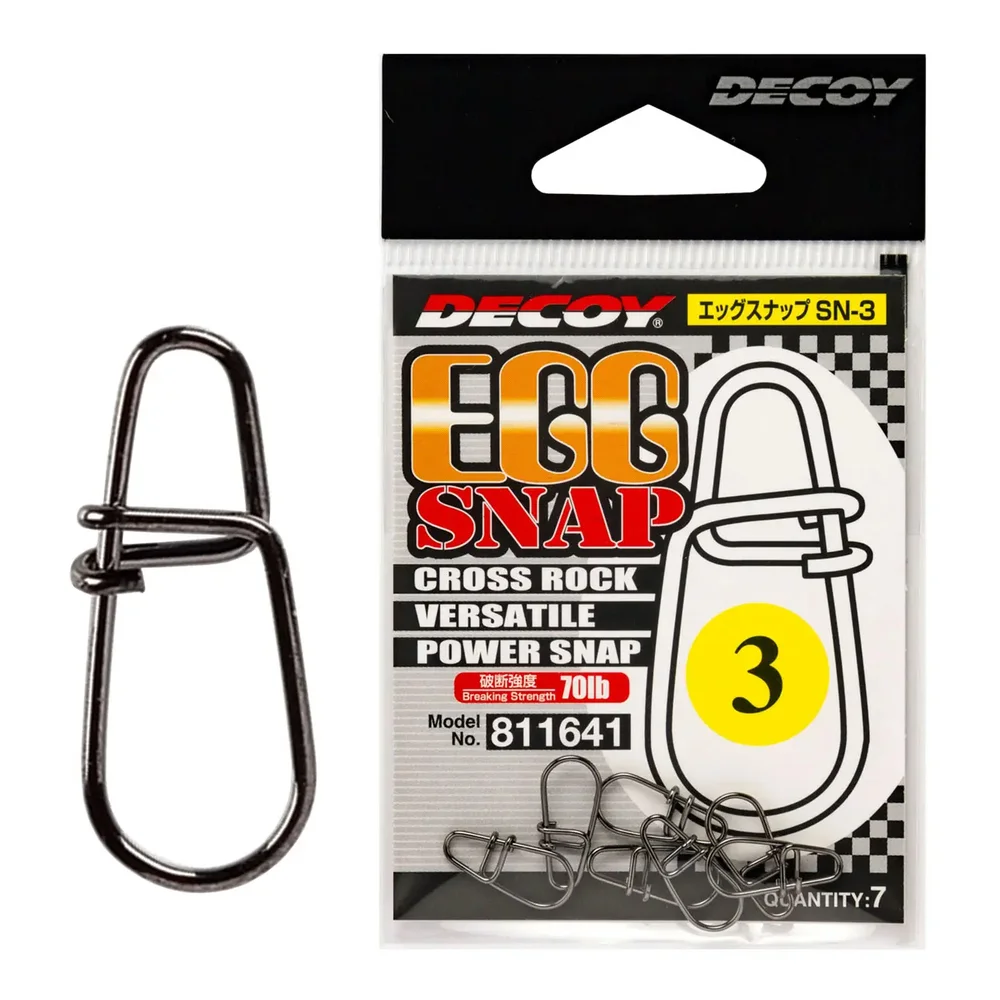 Застежка Decoy SN-3 Egg Snap имеет овальную форму, которая позволяет использовать её с приманками любого типа, а разрывной нагрузки будет достаточно для снастей различной мощности. В ней использован крестообразный замок, который исключает самопроизвольное расстёгивание даже при вываживании крупной рыбы. Застёжка выполнена из высококачественной нержавеющей стали, поэтому в процессе эксплуатации не обладает остаточной деформацией и не окисляется. Благодаря второму свойству может быть использована для рыбалки как в пресной, так и солёной воде.