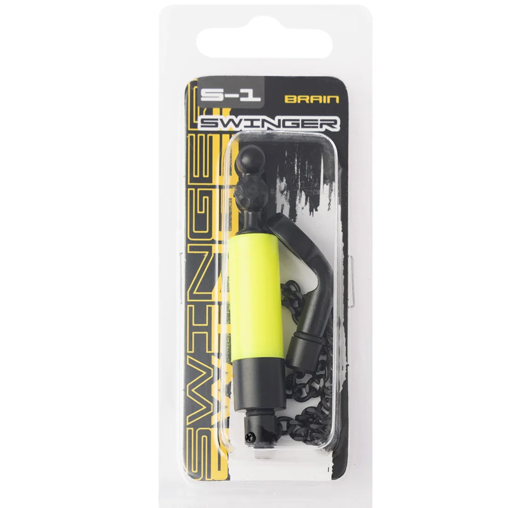 Механічний сигналізатор Brain Swinger S відноситься до категорії хангерів з еластичним кріпленням. Призначений для використання з електронними сигналізаторами для реєстрації клювання, коли риба прослаблює оснащення. Він з одного боку з допомогою кільця кріпиться до стійки, а з протилежного - одягається на волосінь. Конструкція передбачає автоматичне звільнення жилки під час підсічки, при цьому сила стиснення регулюється спеціальним гвинтом. Сигналізатор має металеве кріплення і ланцюжок, завдяки чому досягнуто висока надійність. Збільшена маса допомагає більш точно визначити клювання у вітряну погоду.Сигналізатор Brain Swinger S випускається в чотирьох яскравих кольорах, що допоможе з великої відстані визначити снасть, на якій сталося клювання.
