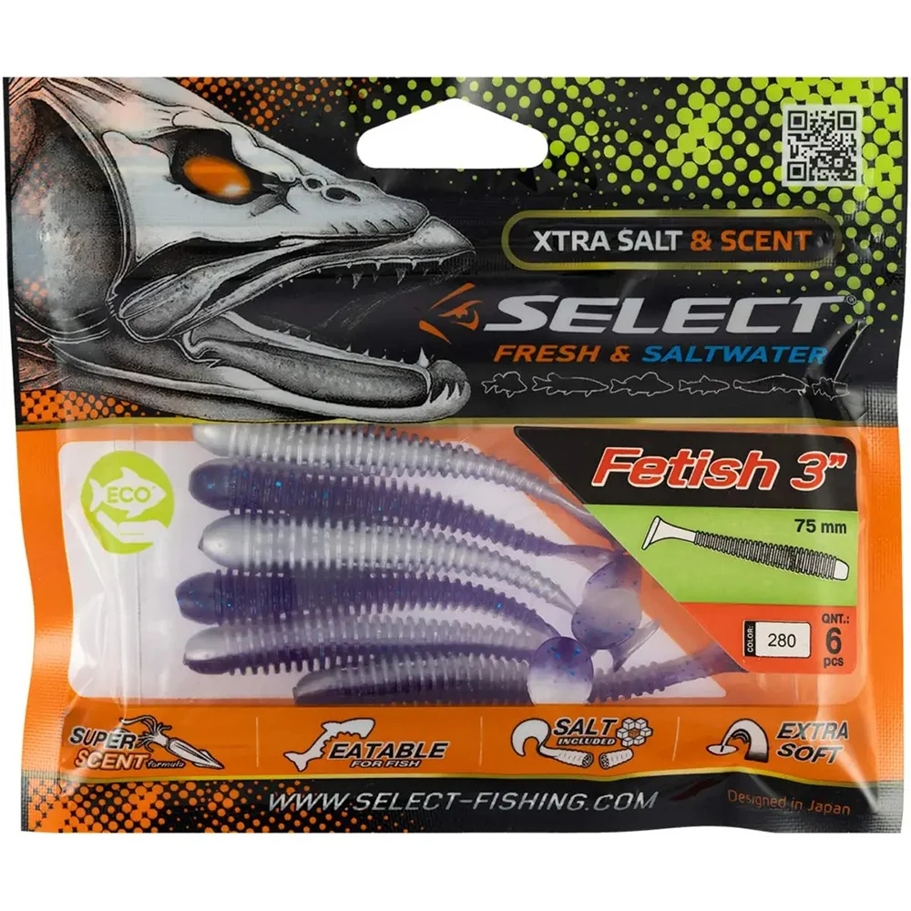Select Fetish - віброхвіст витягнутої форми, все тіло якого покрите м'якими ребрами. Під час проводки, за рахунок еластичності матеріалу, хвіст дуже розмашисто виляє по сторонам, вібрація від якого з великої відстані приваблює рибу. Ребра на тілі виконують кілька функцій. По-перше, вони створюють додаткову вібрацію, що приваблює рибу. По-друге, рифлене тіло на багато м'якше цільного, що позитивно позначається на грі приманки. По-третє, при клюванні риби, ребра легко зминаються і починають активно виділяти смакові добавки, що містяться в складі силікону, так що риба не помічає підступності і продовжує його заковтувати. Крім класичної джигової проводки, зважаючи на свою форму, приманка показує хороші результати при протягуванні по дну. Спокусливі виляння всім тілом і каламуть, що піднімається з дна джиг-головкою, активно привертають увагу риби, яка сміливо кидається на силікон.