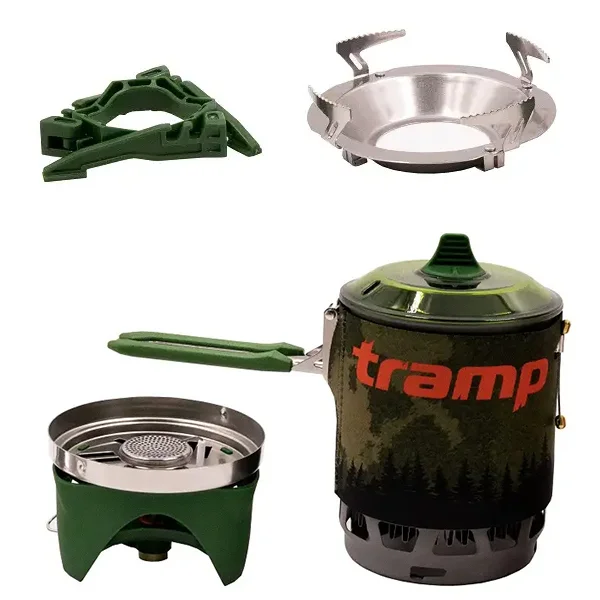 Система для приготовления пищи Tramp UTRG-115-olive Интегрированная система приготовления пищи Tramp UTRG-115-olive состоит из котелка на 1 литр в неопреновом чехле со встроенным в ветрозащитный экран радиатором – теплообменником и подключаемой к нему газовой горелки, а так же подставки под газовые баллоны и таганка для использования другой посуды в режиме обычной горелки. Преимущества системы Tramp UTRG-115-olive: в отличии от классических походных горелок имеет КПД порядка 74 %; за счет интегрированной конструкции экономит порядка 30 % топлива; за счет минимизации потери тепла скорость и качество приготовления пищи увеличивается; за счет снижения количества потребляемого газа вам нужно брать с собой меньше баллонов, а следовательно - система экономит транспортируемый вес и объем места в вашем рюкзаке занимаемого топливом, а так же ваши деньги; все элементы системы помещаются внутрь котелка вместе с газовым баллоном на 100 мл (баллон в комплект не входит) и занимает минимум места в рюкзаке; котелок имеет удобную складную руку с надежной фиксацией и обшит термочехлом из неопрена, который препятствует быстрому остыванию пищи или кипятка, и позволяет удерживать или переносить котелок за корпус без риска обжечься, крышка котелка имеет отверстие для стравливания избыточного давления и слива жидкости; в комплект входит подставка под все типы и объемы резьбовых газовых картриджей, увеличивающая площадь опоры, и как следствие устойчивость системы при готовке на неровной поверхности; система так же комплектуется подставкой – таганком на которую можно, при необходимости, устанавливать котелки большего объема и другой конструкции, а так же сковородки. Особенности: Система рассчитана на одного – двух человек и рекомендована для использования туристам, альпинистам, скалолазам, вело путешественникам и всем, кому необходимо по максимуму облегчить вес рюкзака, быстро и эффективно готовить в сложных экспедиционных условиях. Комплектация: крышка, горелка, подставка под все типы газовых балонов, таганок для другой посуды (котелков, сковородок) котелок со складной ручкой объемом 1000 мл. Характеристики: Система расчитана на использование от 1 до 3 человек Материал: нержавеющая сталь, алюминий, латунь, силикон, нопрен, резина, пластик Вес: 630 гр. Мощность: 2200 Вт Расход газа: 1.7 грамм в минуту Время работы на 1 баллоне 110 г. – 66 мин. 230 г. – 138 мин. 450 г. – 270 мин. Размер: в разложенном виде: 254 x 265 мм в сложенном виде: 133 x 205 мм Номинальное давление газа: 0,39-0,65 мПа Объем котелка: 1 литр. Время закипания 1 л. воды: 3 мин. 05 сек. Цвет: оливковый