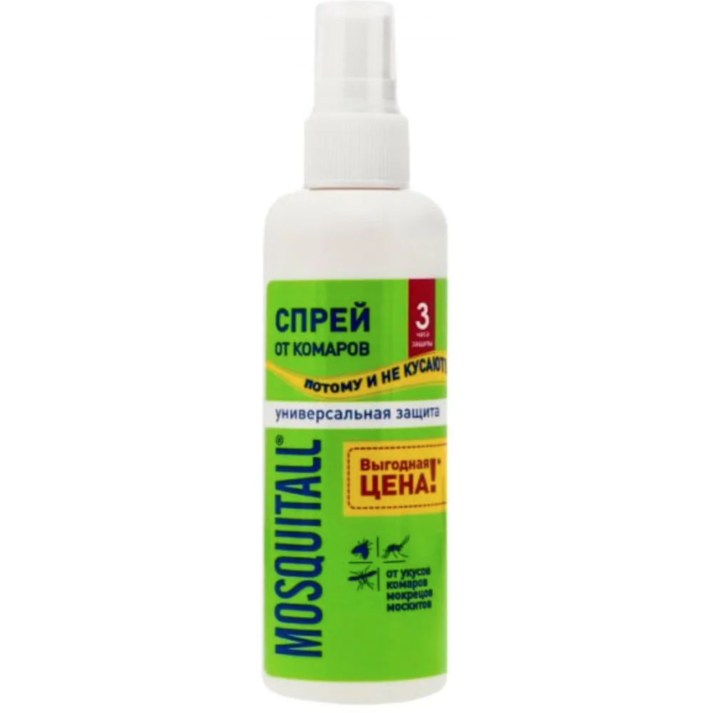 Mosquitall спрей (100 мл) - це ідеальний та ефективний засіб для захисту всієї родини, дозволений до застосування дітям з 5 років, від укусів комарів та москітів, мокреців та інших комах.