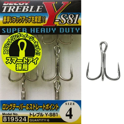 Decoy Y-S81 - трійники підвищеної міцності для оснащення приманок спінінга. Крім потужного загартованого дроту, що надає міцності, мають особливий вигин, що практично виключає розгинання гачка при виведенні. Особливістю даної серії трійників є спеціальне вушко, що значно спрощує їх монтаж на кільця заводні приманки. Мають антикорозійне покриття, що захищає від окислення. Decoy Y-S81 - хороший вибір для тих, хто шукає потужні та якісні трійники із запасом міцності.