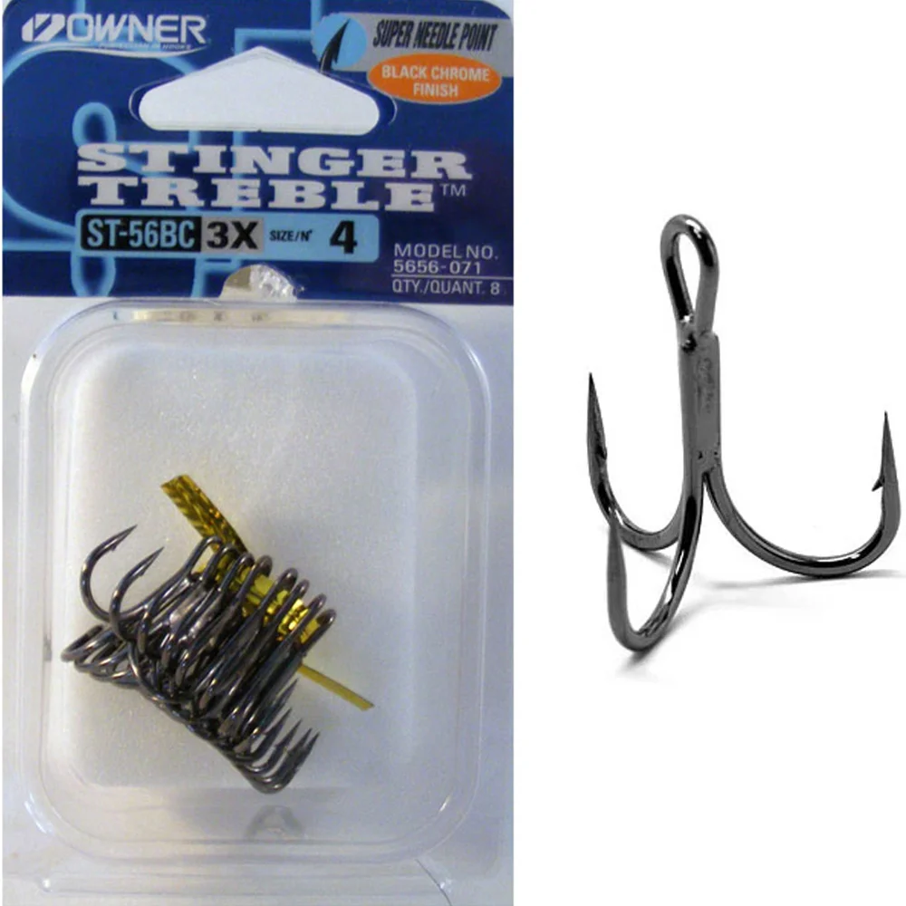Owner ST-56 BC 5656 - серія потужних потрійних гачків для лову хижака, що характеризується широким круглим загином, кованим піддівом, короткою цівкою і захисним покриттям Black Chrome. За відносно невеликих розмірів трійники Owner 5656 надзвичайно міцні і надійні. Розігнути їх практично неможливо! Призначені для оснащення малогабаритних приманок і наживок, що використовуються в лові сильної, як правило, морської риби. Посилена конструкція гачка Owner ST-56, надгострі жала c заточуванням Super Needle Point і нормальної величини борідка гарантують ефективне підсікання та впевнене утримання будь-якої риби, що клюнула.