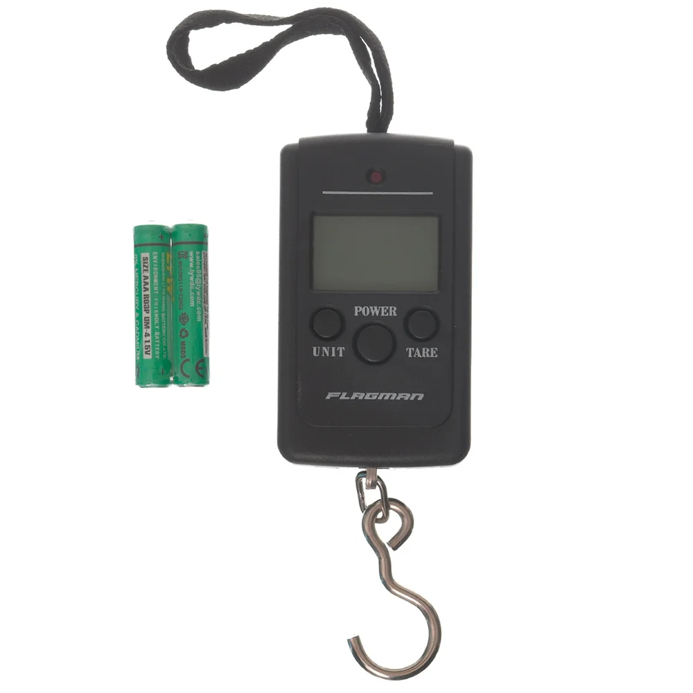 Flagman Electronic Scales – невеликі електронні ваги, які призначено для зважування улову. Їх виготовлено з ударостійкого АБС-пластику та розраховано на зважування трофеїв із вагою до 20 кг. Точність вимірювання – 5 г. Ваги Flagman Electronic Scales обладнано великим рідкокристалічним дисплеєм, міцною ручкою та надійним гаком. Вони мають функції автоматичної та ручної фіксації ваги, обнулення тари, автоматичного вимкнення після 90 секунд простою. Доступні одиниці вимірювання: кілограми (kg), фунти (lb), грами (g), унції (oz). Живлення: 2 елементи ААА (у комплекті).