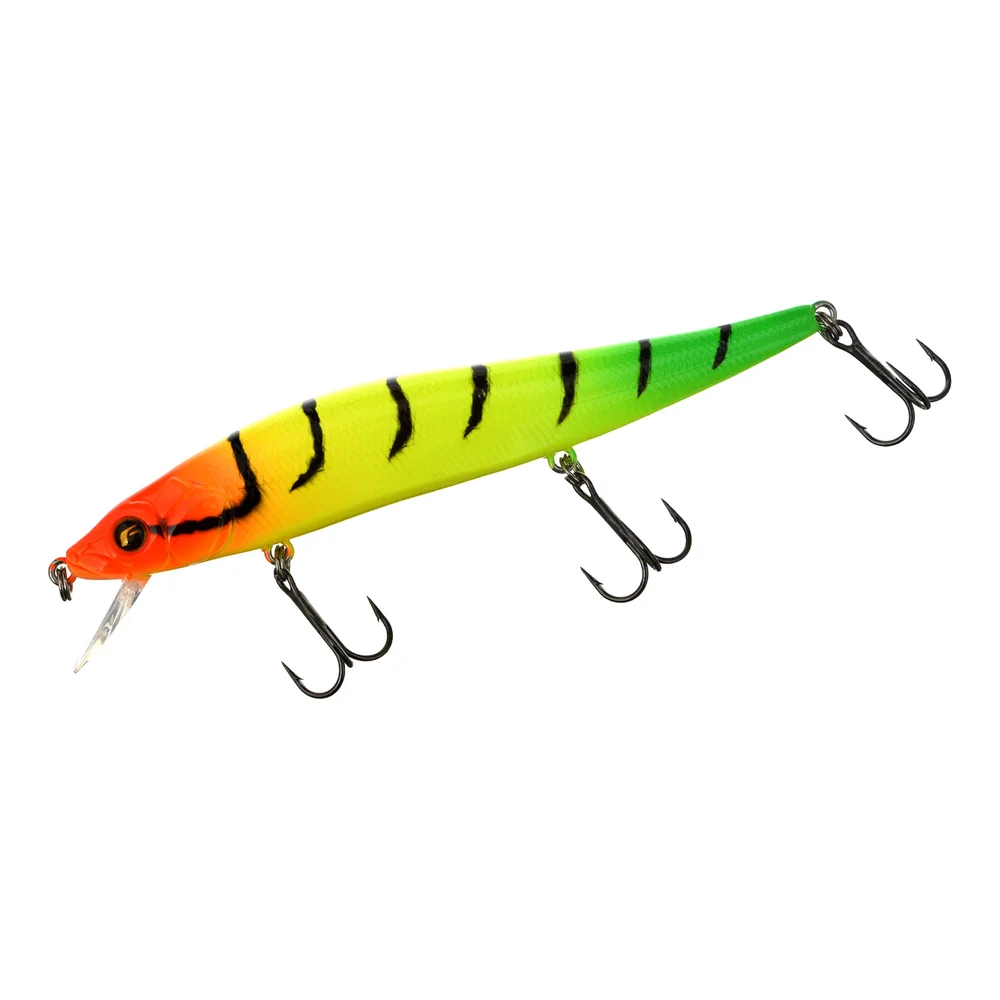 Воблер Flagman Bossy 110F – чудова приманка для швидкого та ефективного облову великих мілководних ділянок. Цей плаваючий воблер мінноу витягнутої форми важить 14,5 г і має довжину 110 мм. Завдяки системі далекого закидання Flagman Bossy 110F летить не тільки далеко, але й дуже точно. Рухливі сталеві кульки під час закидання відходять далеко у хвіст, зміщуючи туди центр ваги приманки. З першим же ривком вони повертаються на місце, де фіксуються спеціальним припливом знизу, завдяки чому під час проведення баланс приманки залишається незмінним. Кульки видають тихий звук високої частоти, що приваблює хижака з великих відстаней. Воблер має власну гру, але рівномірне проведення не є основним, його спеціалізація – твічінг. Лобовий опір воблера не надто великий, тому для ривкових проведень Flagman Bossy немає необхідності використовувати наджорсткі вудлища. Під час ривків воблер робить довгі проходи за інерцією, не сильно відхиляючись убік, а після зупинки повільно спливає, погойдуючи боками й демонструючи затухаючий ролінг. Flagman Bossy 110F працює на різних стилях ривкового проведення. Однаково добре він грає і на жорсткому короткому твічі, і на потяжках. Тривалі паузи нерідко провокують на атаку щуку і трофейного окуня. Більшість моделей покрито спеціальною фарбою, яка світиться в ультрафіолеті, що є додатковим стимулом для хижаків атакувати приманку. Усі воблери Bossy оснащено надійними завідними кільцями та дуже гострими потрійними гачками VMC.