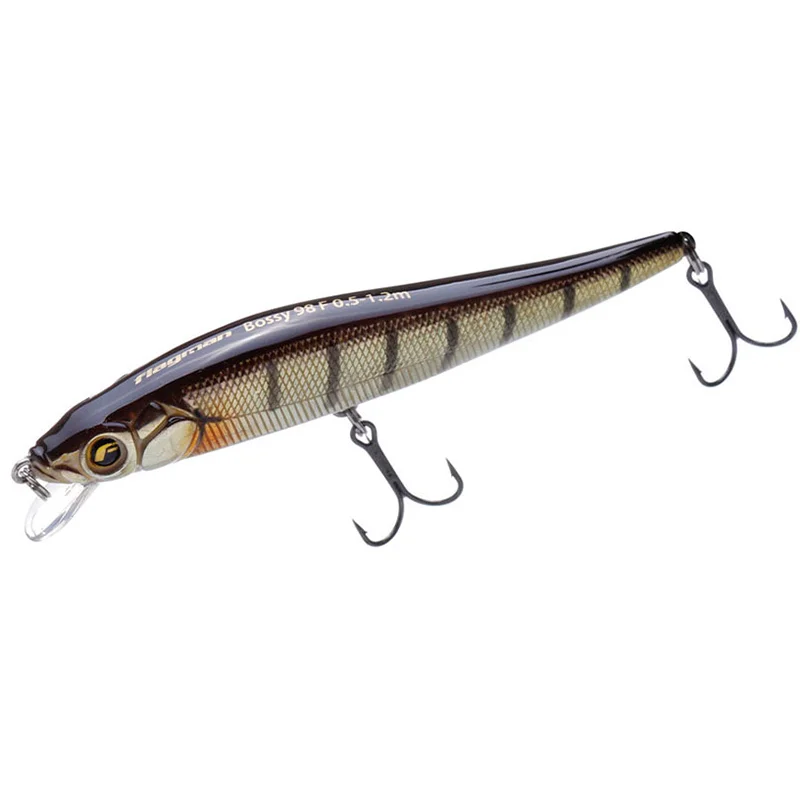 Чудова принада для швидкого і ефективного облову великих мілководь. Це воблер minnow витягнутої форми, важить він 14,5 г і має довжину 110 мм. Завдяки системі далекого закидання летить не тільки далеко, але і дуже точно. Рухливі сталеві кульки при закиданні йдуть далеко в хвіст і сильно зміщують туди центр ваги. При першому ж ривку вони повертаються на місце і фіксуються спеціальним припливом знизу, завдяки чому при проводці балансування залишається незмінною. Кульки видають відносно неголосний звук високої частоти. Воблер володіє власною грою, але рівномірна проводка не виступає основною, його спеціалізація - твічінг. При ривках Bossy робить довгі «запливи» по інерції, що мають складну траєкторію. Причому, він відразу різко відхиляється в сторону, і амплітуда його рухів виходить дуже велика. Bossy - суспендер, після зупинки руху він зависає в товщі води. Тривалі паузи нерідко провокують на атаку щуку і великого окуня. Лобовий опір воблера не надто великий, тому для ривкової проводки немає необхідності використовувати наджорсткі вудлища. Розмір (діапазон): 80-110 мм Довжина: 9,8 см Вага (діапазон): 5-12 г Вага: 9 г Заглиблення: 0.5-1.2 м Плавучість: плаваючий