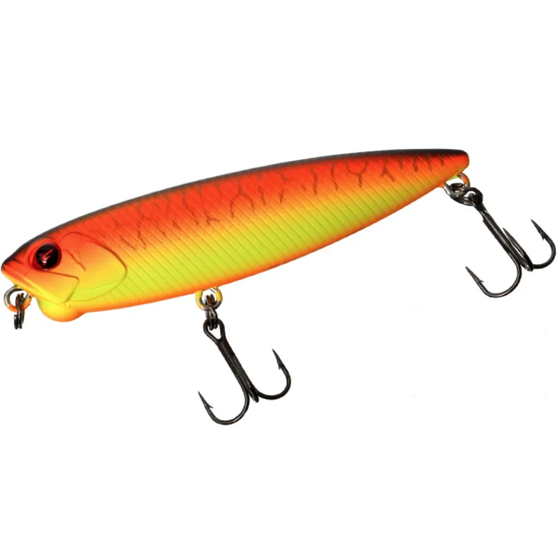 Воблер Flagman ChipperWod – ефективна класична приманка класу вокер, яку призначено для ловлі хижака з поверхні води. Її виготовлено з високоякісного пластику. Вона має міцне багатошарове фарбування, оснащена посиленими завідними кільцями та надзвичайно гострими гачками VMC. У передній частині цього воблера розміщено спеціальну опуклу півсферу, завдяки якій приманка створює додаткові завихрення, що змушують її ефектно малювати «змійку» навіть за найповільніших проведень. Така особливість значно спрощує управління під час проведення Walking The Dog навіть в умовах незначних хвиль на поверхні води. Як і всі приманки цієї концепції під час проведення ChipperWod поводиться досить шумно: хлюпається, пускає бульбашки, іноді практично повністю вистрибує з води, а потім голосно туди плюхається. Центр ваги Flagman ChipperWod розташовано в задній частині, що забезпечує чудові аеродинамічні характеристики. Крім цього, у тілі приманки обладнано шумову капсулу, завдяки якій утворюються звуки, що приваблюють хижака з великих відстаней. Низку моделей Flagman ChipperWod покрито 3D фольгою («бите скло»), а також унікальною фарбою, яка світиться в ультрафіолеті. Це чудові приманки для ловлі з поверхні води окуня, щуки та жереха у водоймах найрізноманітніших типів. Доступні в розмірах 65, 75 і 100 мм із вагою 5.5, 8 і 14 грам відповідно. Розмір (діапазон): 50-80 мм Довжина: 6,5 см Вага (діапазон): 5-12 г Вага: 5.5 г Плавучість: плаваючий