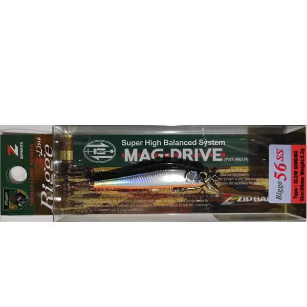 Японський воблер ZipBaits RIGGE 56SS - уловиста приманка класу Minnow, що стала культовою не тільки на внутрішньому японському ринку (JDM), але далеко за його межами. досвідчених «зубрів». На відміну від аналогічних «мінношок» з класичною прогонистою формою, 56-й «рідж» має більш округлий корпус, без виражених плоскостей з боків. Області застосування як найкращу приманку для лову лососевих видів риби, в тому числі ставкової та струмкової форелі. з можливістю заглиблення до 1 метра. Така особливість дозволяє облавлювати, як мілководні ділянки водоймища, так і прочісувати глибоководні локації у пошуках трофеїв. Конструктивні особливості Ультралайтова приманка виготовлена з якісного удароміцного пластику. У передній частині встановлена широка лопать, що заглиблює, має форму сплющеної краплі. Металева петля для кріплення повідця вмонтована безпосередньо біля прозорого тіла лопатки, що позитивно вплинуло на загальну гру. Подібності з живим «мальком» додають трохи опуклі 3D-очі. Усередині корпусу японські воблеробудівники реалізували запатентовану компанією ZipBaits технологію Mag-Drive - магнітну систему далекого закидання та точного балансування. клас – Minnow; довжина - 56 мм; вага - 3.2 грами; робоча глубина - 0,3-0,8 метра; тип - повільно-тоне (Slow Sinking).
