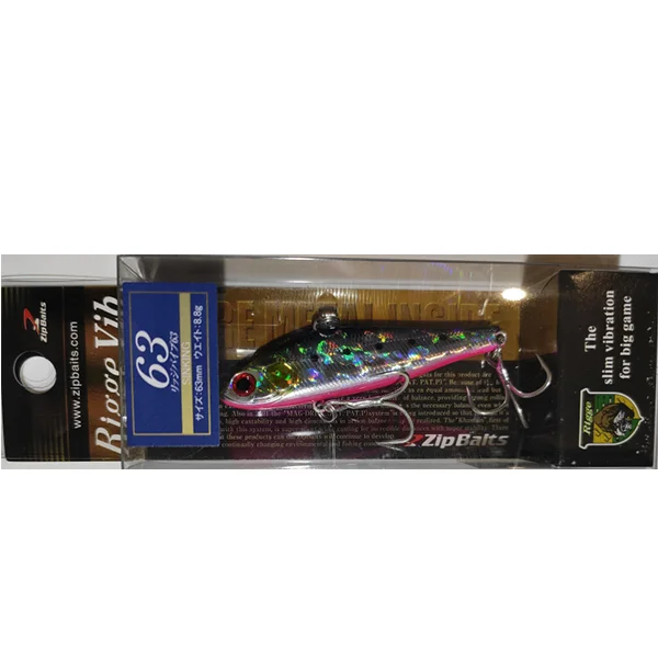 ZIP BAITS RIGGE VIB 63 – це воблер типу раттлін від всесвітньо відомого флагмана ZIP BAITS. Він спроектований для лову в морській воді, але в наших умовах відмінно виявив собі і в пресноводних водоймах при лові таких хижаків як щука, окунь, судак та жерех. Причому він однаково ефективний як у перебігу, так і в стоячій воді. Алгоритм дій за його можливої анімації можна наступним чином. Після закидання даєте приманці заглибитись до потрібного вам горизонту, враховуючи, що її конструкція тоне. Потім, вибравши слабину волосіні, робіть вудлищем 2-3 короткі ривочки і даєте воблеру знову вільно затонути. Після цього цикл багаторазово повторюється. Клювання хижака здебільшого відбуваються якраз на паузі і потрібно завжди бути готовим до блискавичної підсічки. Замість лопаті, у нього є, що замінює її, плоску площадку, а кільце розташоване на кшталт балансира, по центру спинки. Виготовлений воблер з певними особливостями, такими як: розрахований на довготривалі використання; поверхня воблера покриває, що імітує луску, текстуроване покриття; очі приманки виблискують натуральним блиском; великі, що виділяються на воблері, вони працюють, залучаючи хижаків, як точки прицілу; серед якої можна знайти безліч натуральних окрасів для ясного дня, та кислотні, яскраві кольори, ефективність яких доведена ловом у сутінках та у каламутній воді;