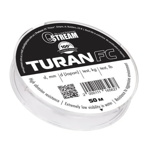 Флюорокарбон TURAN від ТМ «G.STREAM» виготовлений із надміцного матеріалу, який має низьке розтягування та чудовий опір до стирання. Ідеально підходить для лову в складних умовах, коли довговічність має першорядне значення. Застосовується в спінінговому, фідерному та інших видах лову в будь-яку пору року. Взимку флюорокарбонові волосіні не обмерзають і не втрачають міцності. У спінінговому лові, на відміну від металевих повідців, не обтяжує приманку і не впливає на її гру. Флюорокарбон TURAN непомітний у воді і не страждає від прямих сонячних променів.
