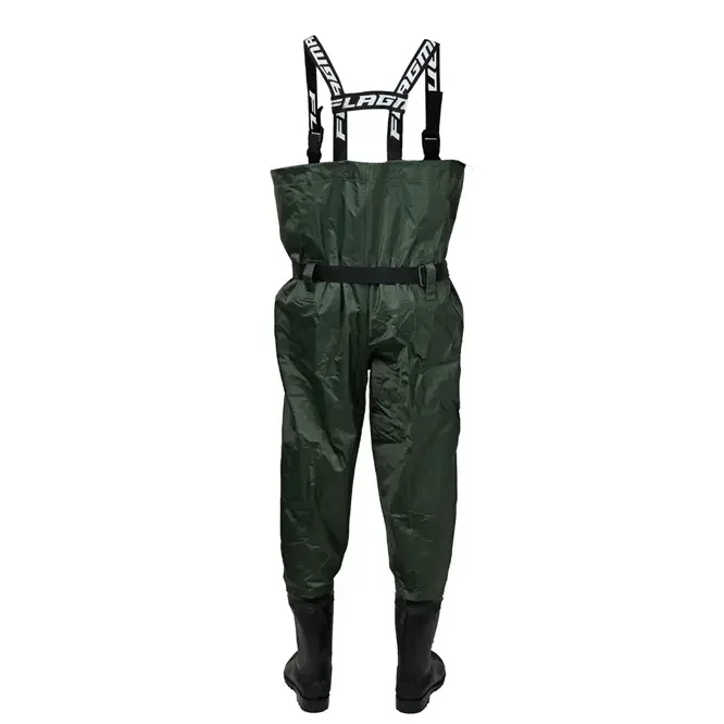 Забродний напівкомбінезон Flagman QYNCW-101 ідеально підійде для риболовлі та полювання в найрізноманітніших погодних умовах. Цей забродний костюм виготовлено з легкого, еластичного, міцного та водонепроникного ПВХ-матеріалу з інтегрованими в нього чобітьми. Міцні гумові чоботи містять вклеєні всередину неопренові вставки, які захищають ноги від переохолодження, а також мають зносостійку підошву з товстим глибоким протектором, який запобігає ковзанню на мулистому ґрунті. Шов з'єднання із чобітьми та шви крою міцно зварені, що виключає будь-які протікання води та забезпечує повну герметичність виробу. Зручні широкі шлейки напівкомбінезона мають надійні пластикові застібки фастекс і регулюються по висоті відповідно до зросту користувача. Також у конструкції вейдерсів Flagman передбачені шльовки під ремінь + регульований поясний ремінь на застібці фастекс, а також містка нагрудна кишеня з клапаном на липучці. ПВХ вейдерси Flagman дають змогу перебувати тривалий час у воді, не відчуваючи дискомфорту, не потребують спеціального догляду, не бояться низьких температур та стійкі до впливу ультрафіолетового випромінювання.