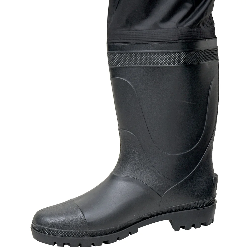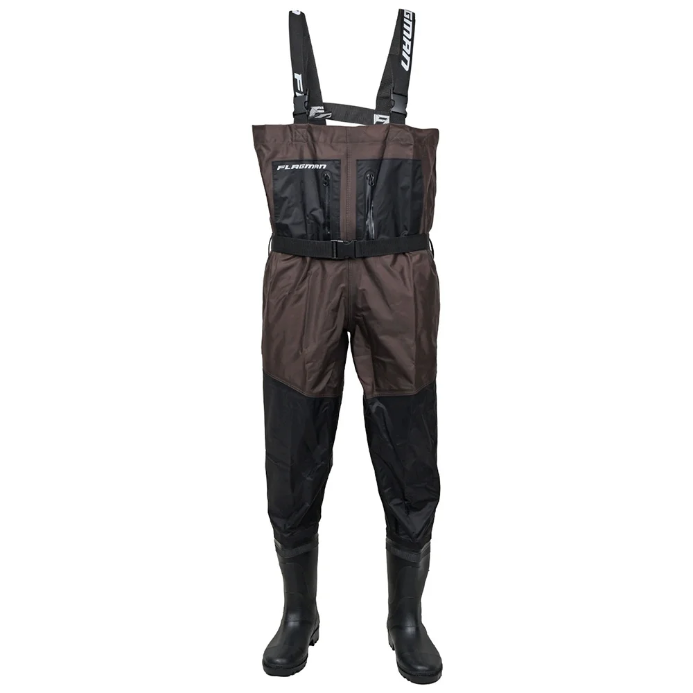 Забродний напівкомбінезон Flagman PRO ідеально підійде для риболовлі та полювання в найрізноманітніших погодних умовах. Цей забродний костюм виготовлено з легкого, еластичного, міцного та водонепроникного ПВХ-матеріалу з інтегрованими в нього чобітьми. Міцні гумові чоботи містять вклеєні всередину неопренові вставки, які захищають ноги від переохолодження, а також мають зносостійку підошву з товстим глибоким протектором, який запобігає ковзанню на мулистому ґрунті. Шов з'єднання із чобітьми та шви крою міцно зварені, що виключає будь-які протікання води та забезпечує повну герметичність виробу. Зручні широкі шлейки напівкомбінезона мають надійні пластикові застібки фастекс і регулюються по висоті відповідно до зросту користувача. Також у конструкції вейдерсів Flagman PRO передбачені шльовки під ремінь + регульований поясний ремінь на застібці фастекс, а також дві місткі нагрудні кишені, які закриваються на водонепроникні блискавки. ПВХ вейдерси Flagman дають змогу перебувати тривалий час у воді, не відчуваючи дискомфорту, не потребують спеціального догляду, не бояться низьких температур та стійкі до впливу ультрафіолетового випромінювання.